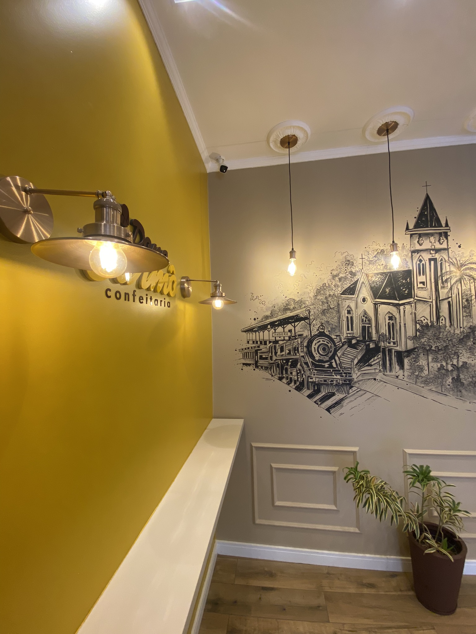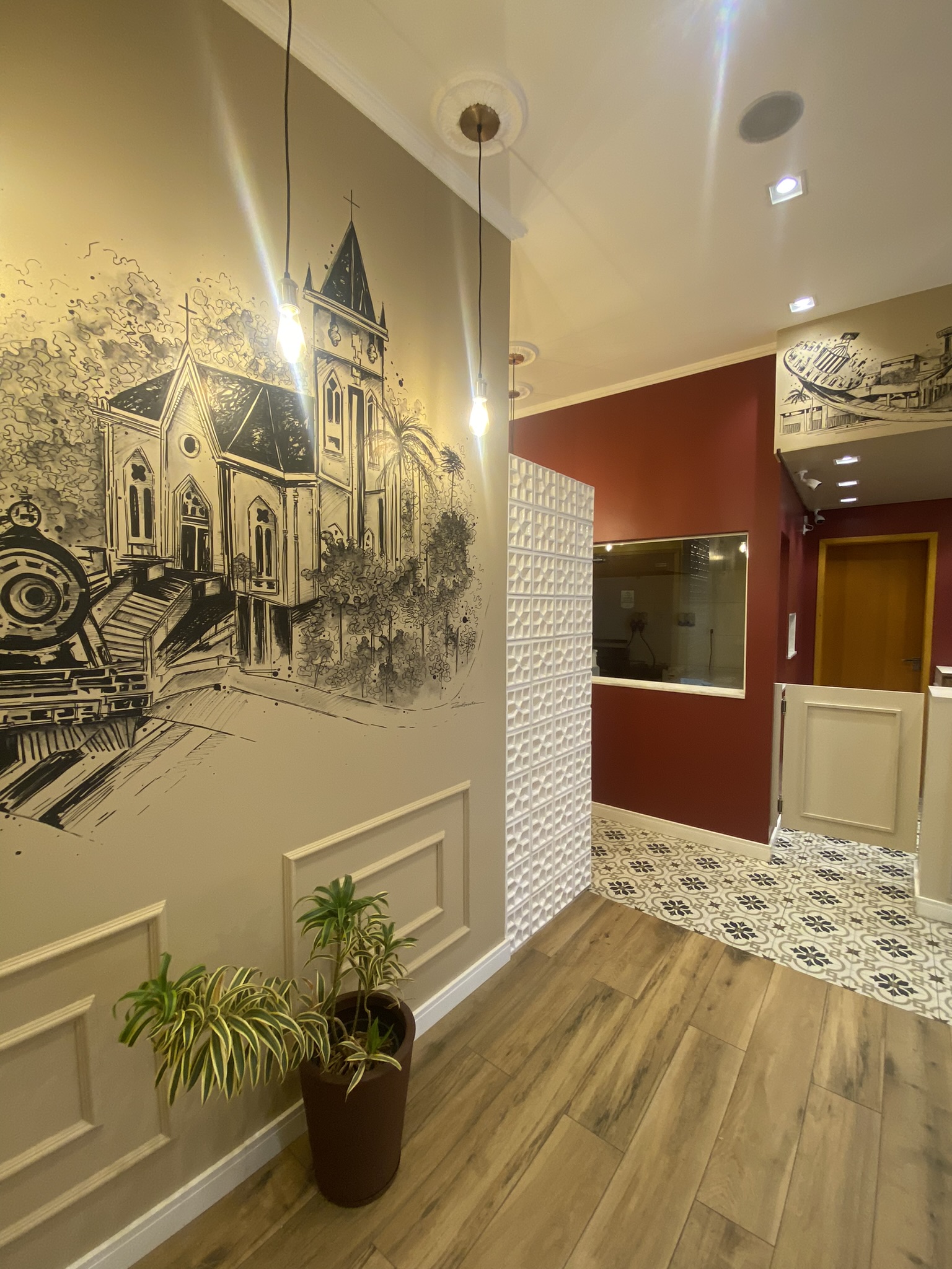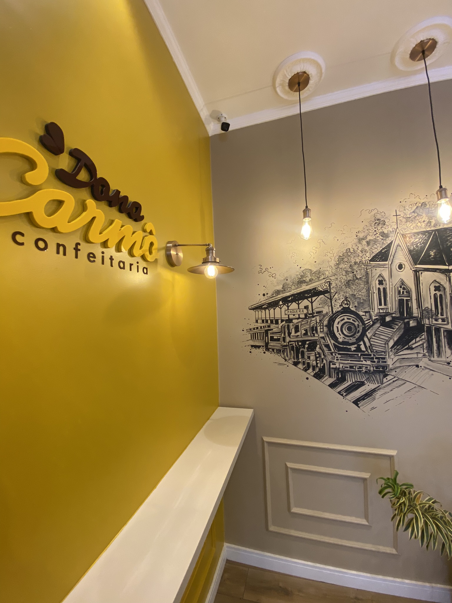 A proprietária Cláudia e o Ivan tinham um desejo especial: trazer a história do bairro para dentro do espaço. A solução foi eternizar, em forma de arte nas paredes, os lugares turísticos e antigos da Vila Carmosina, criando um elo afetivo com a comunidade e uma ambientação única.