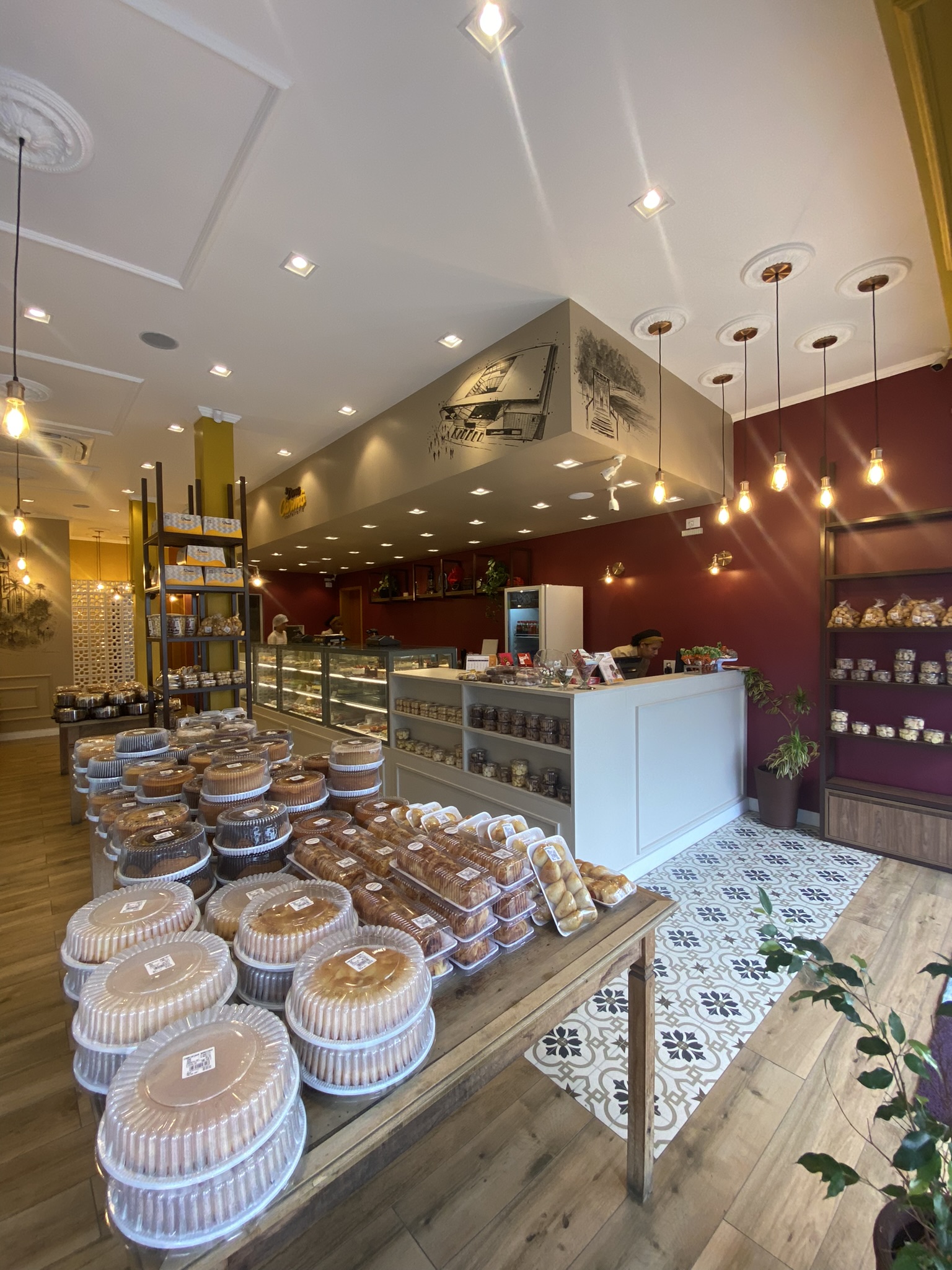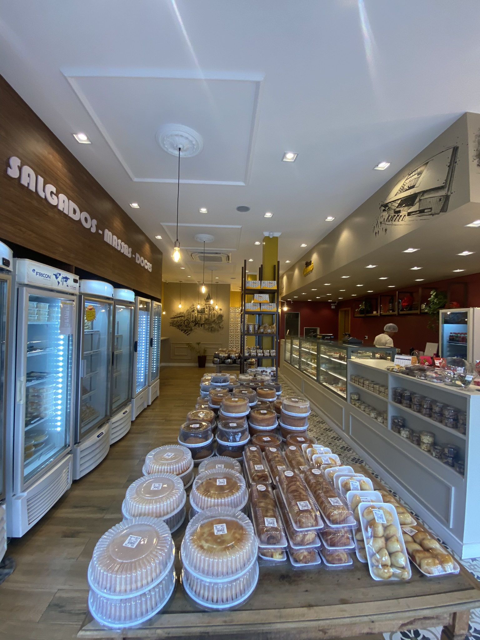 Além da área de atendimento, a reforma incluiu uma ampliação da produção, com setorização dos espaços para diferentes linhas: bolos caseiros, confeitaria e salgados. O estoque também foi expandido, incluindo duas novas câmaras frias, garantindo mais eficiência e capacidade de produção.