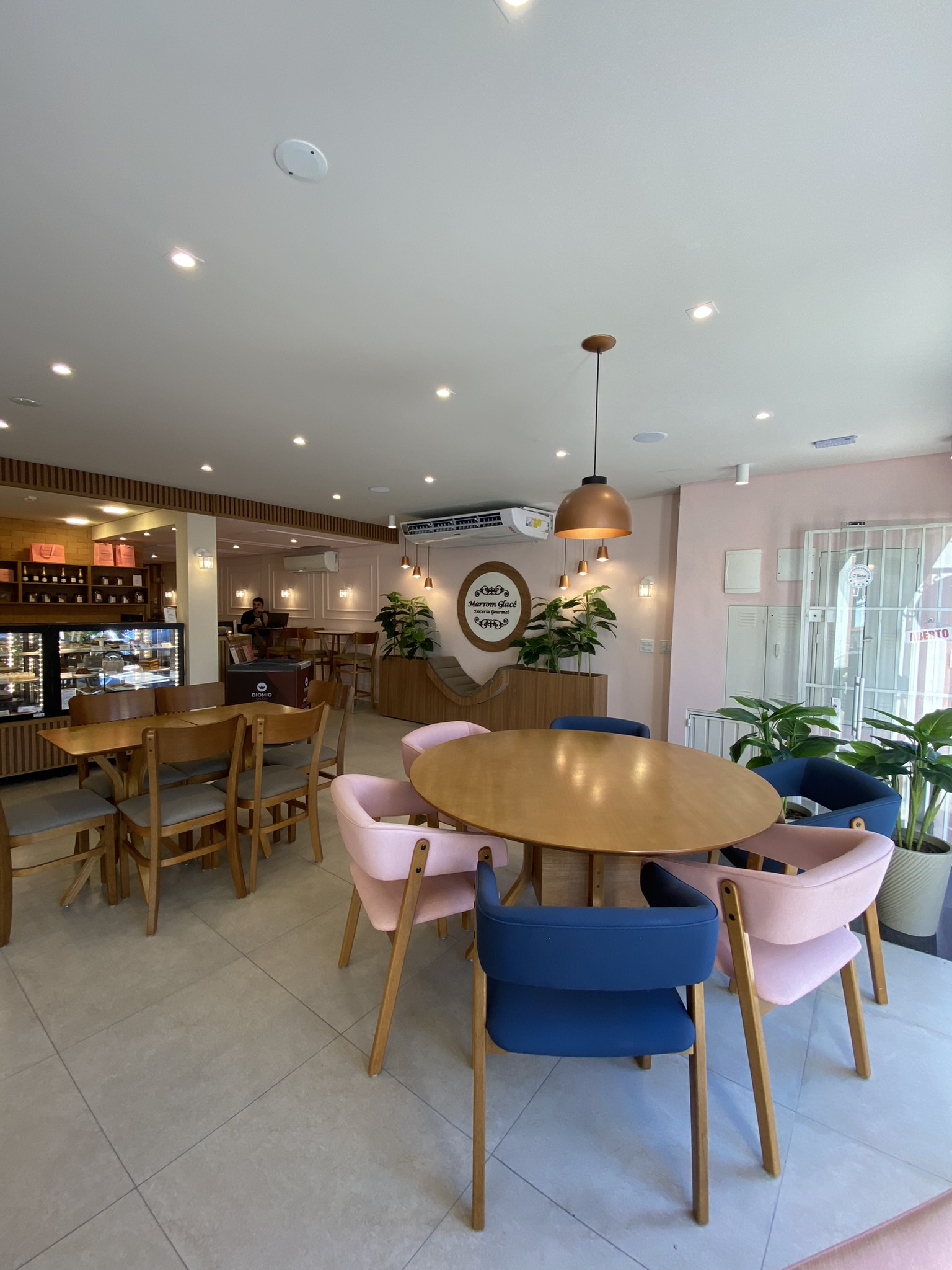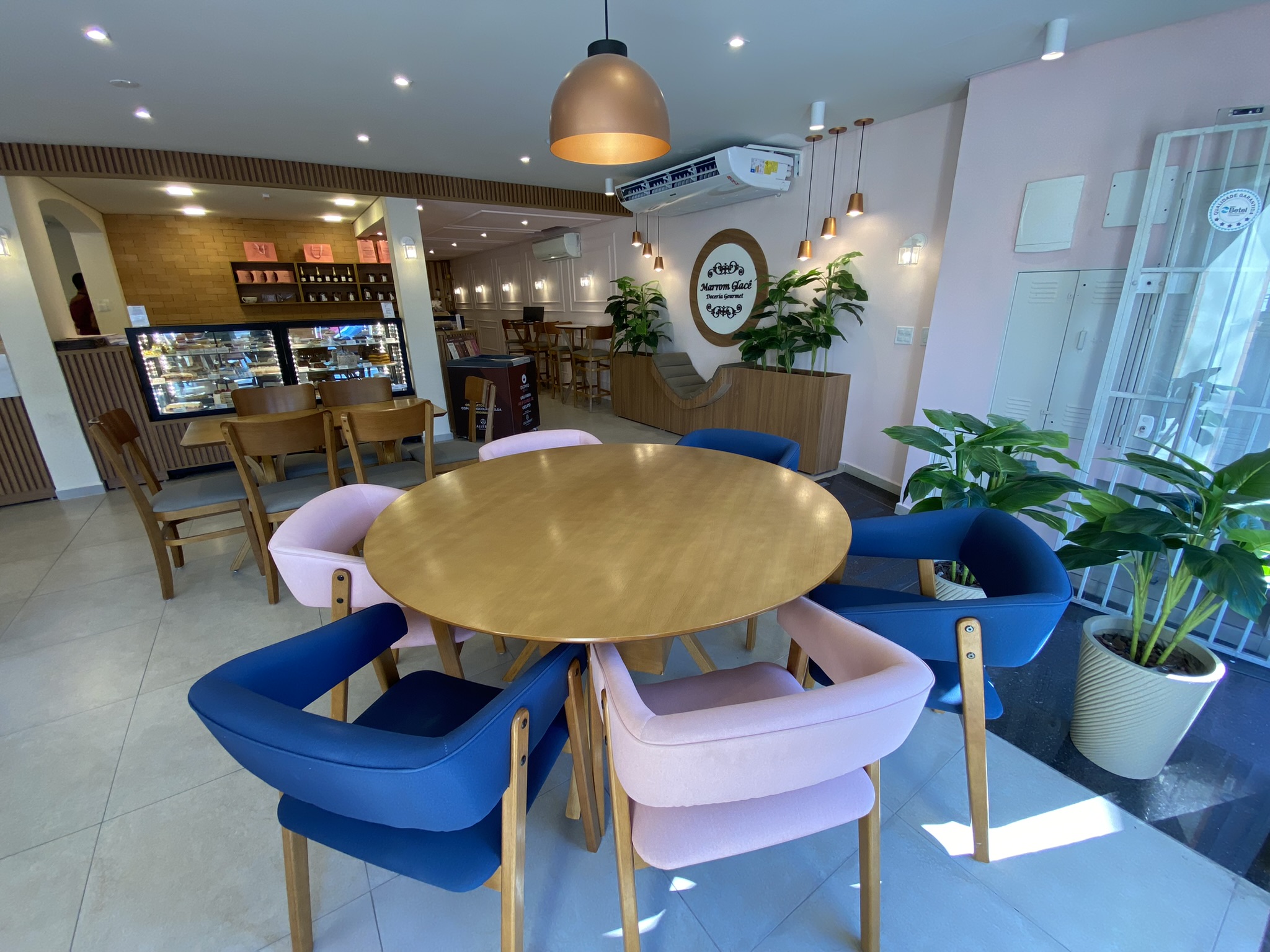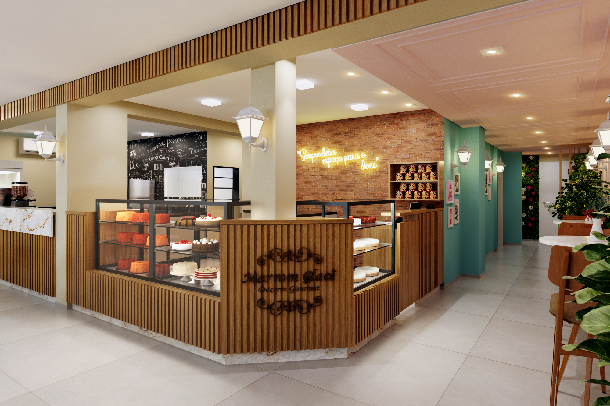 A organização do espaço também foi pensada para valorizar os produtos: as vitrines em formato L logo na entrada permitem que os clientes sejam imediatamente impactados pela variedade de bolos e doces, fortalecendo a experiência de compra.